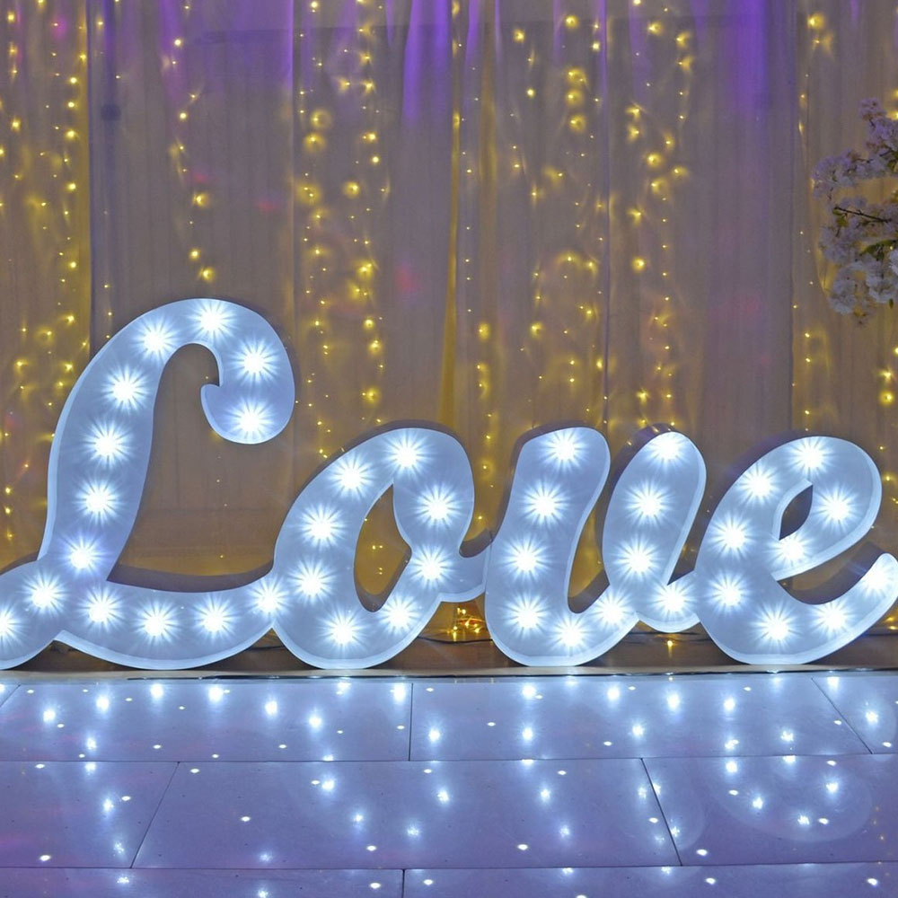 Marquee Letters or Light up Letters deliver more than just light and message.  There size and brightness create a beautiful ambiance in your room.  We have seen these added to all areas of the venue, these look absolutely incredible setup to meet your guests as they arrive to your venue and especially just below your top table or below your cake table.  Regardless of where you want these, they will alway look incredible.